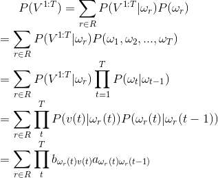 用数学公式表示就是, (V是Visible可见序列, w是隐性状态序列, A,B是HMM状态转移概率矩阵)(公式太多,请具体看我博客中的推导机器学习 --- 4. 大内密探HMM(隐马尔可夫)围捕赌场老千)